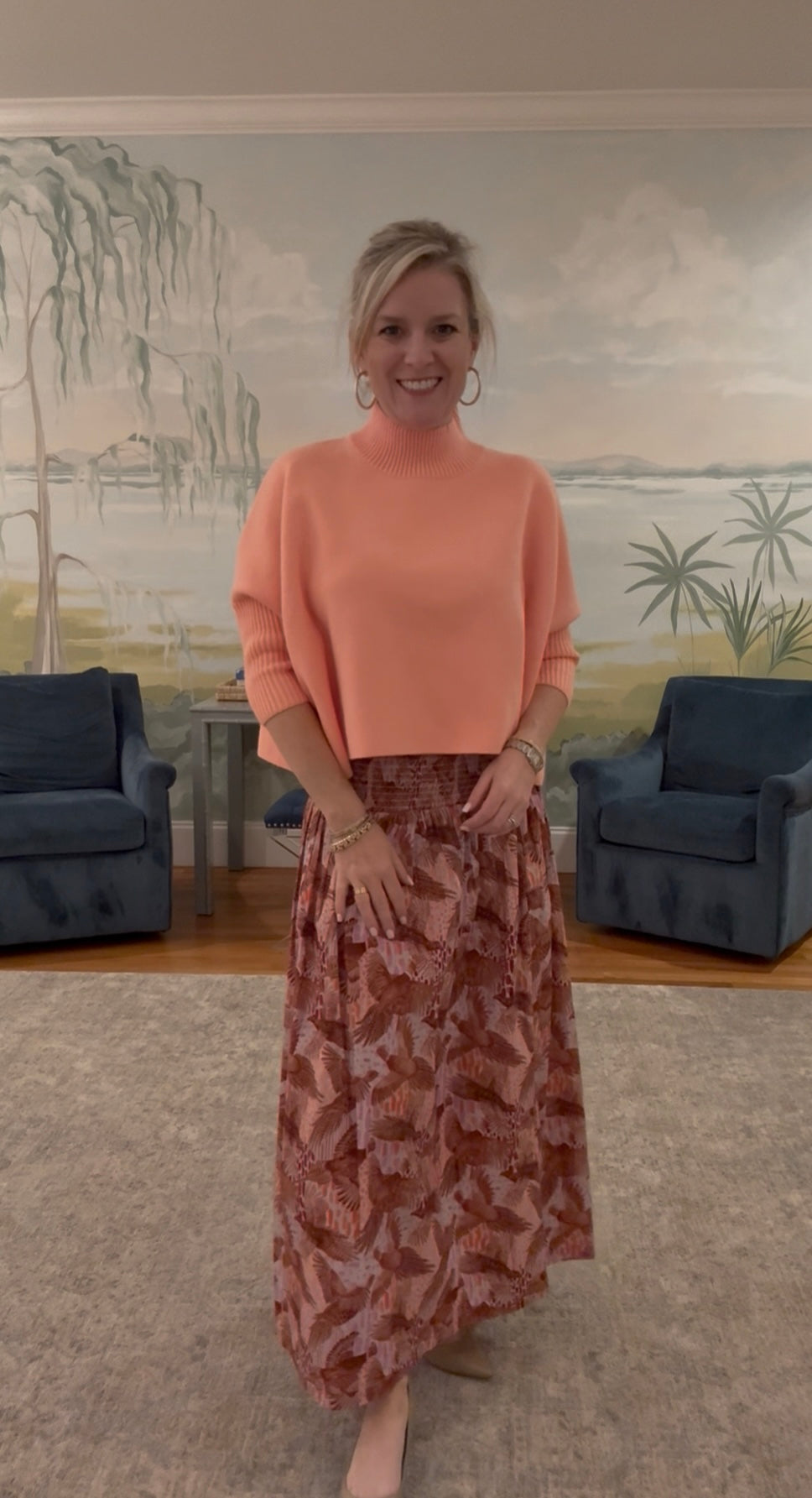 This smocked waist skirt can be styled for your autumn days or your party evenings. This versatile piece will take you from fall fields to the autumn bonfire! Midi length, wide smocked waist, pleats and stretch poplin.