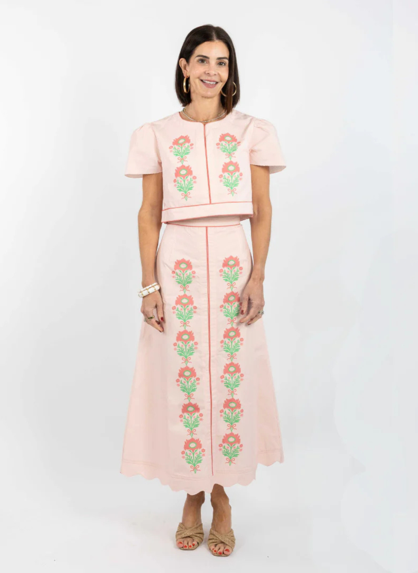 This set features a cropped top and long skirt - but it's designed NOT to show skin (don't worry).  We just love how flattering this set turned out to be - featuring delightful piping detail and a reassuring structure - this one is a new classic!
