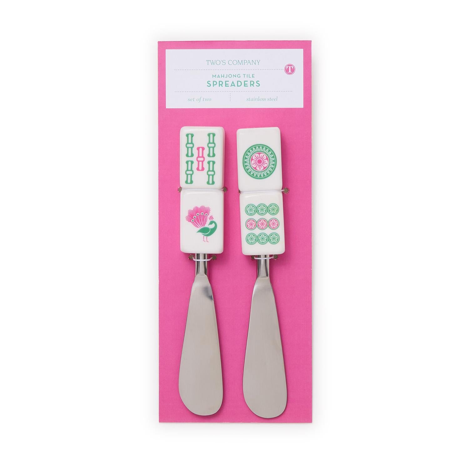 Elevate your next gathering with our Set of 2 Mahjong Spreaders. Crafted from durable resin, these spreaders are not only functional but also a stylish addition to your serve ware collection. Perfect for spreading butter, jam, or cheeses, they add a touch of sophistication to any table setting. Crafted with care, these spreaders are a must-have for any host or hostess.
