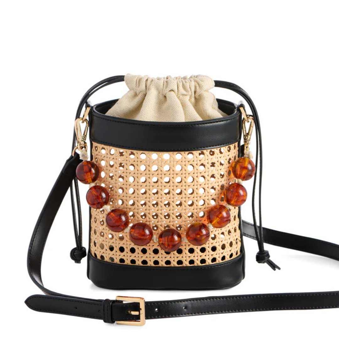 Meet the Lyra Bucket Bag: the playful statement piece your warm-weather wardrobe has been waiting for! With a woven cane body and smooth vegan leather trim, this cross-body beauty features a secure drawstring closure and two interchangeable straps—a classic adjustable cross-body strap and a chunky beaded handle for when you’re feeling extra. Compact yet roomy, it easily fits your phone, sunnies, and other day-out must-haves. Whether you’re beach-bound or brunch-ready, Lyra brings a breezy charm to every outing.