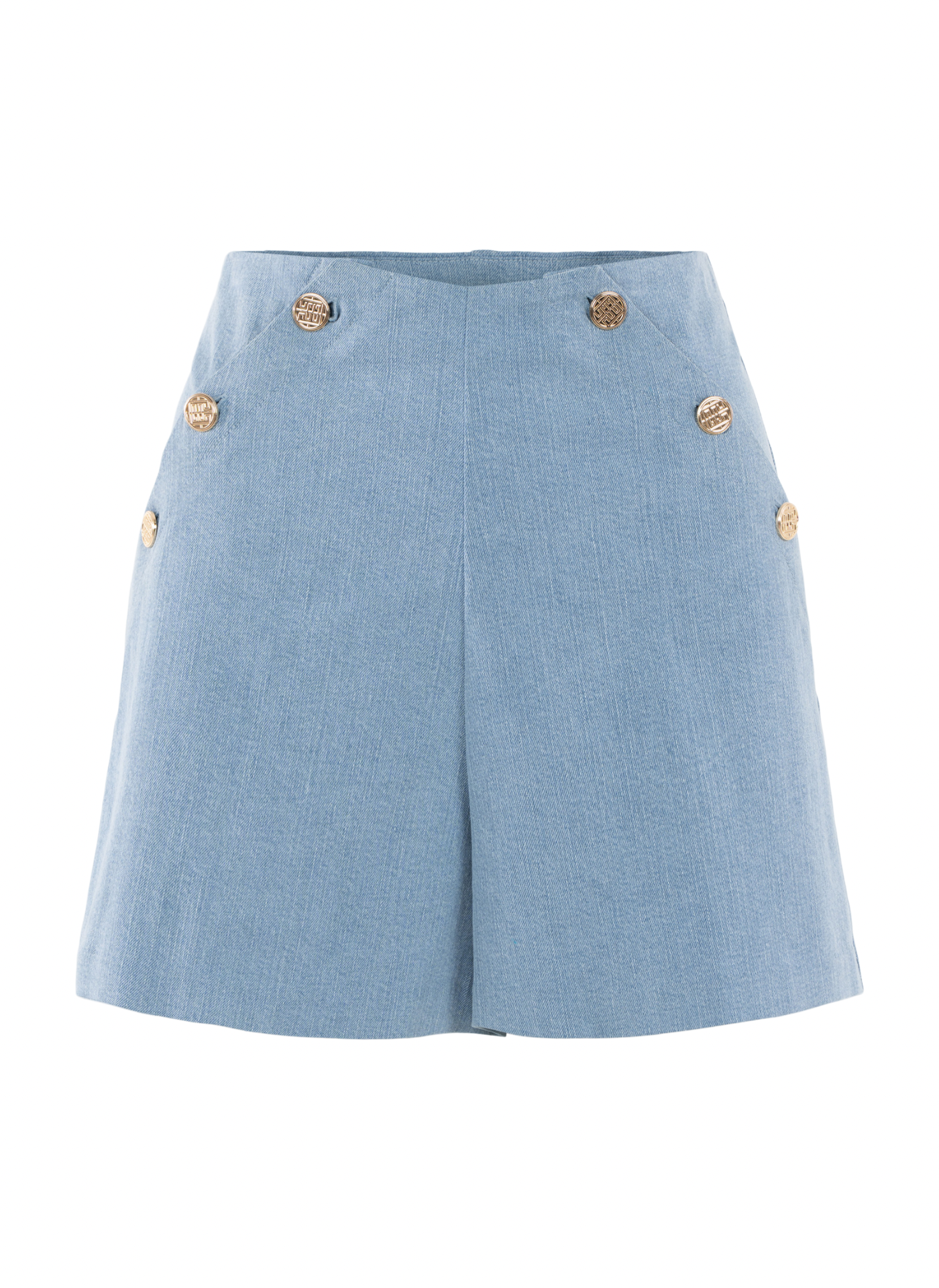 The Saylor Short in Classic Denim is a polished take on a warm-weather classic. Designed with a flattering high-waisted silhouette, this style features a clean A-line shape that creates an elongating, tailored look. Double-sided logo buttons add a refined, signature detail while lending subtle structure to the front.