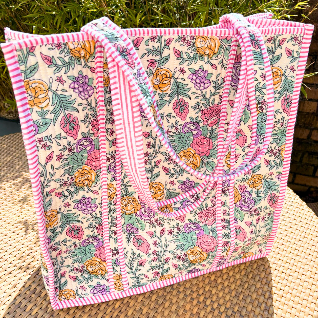 Introducing the tote that does it all! Whether you're heading to the beach, exploring the farmers market, or packing for a weekend getaway, this spacious quilted bag has you covered. With its bold, eye-catching design, you'll turn heads wherever you go. It's the kind of bag that sparks compliments and makes every outing feel a little more fun.