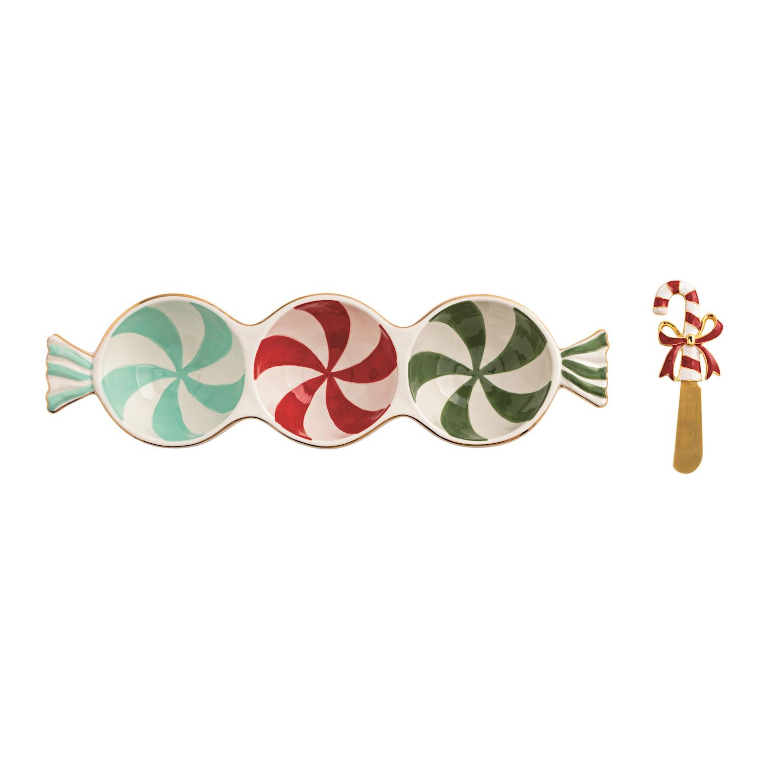 Celebrate the festive season with our Christmas Candy Triple Tidbit Set, a delightful addition to your holiday gatherings. This hand-painted ceramic dish features a charming design, perfect for serving an array of appetizers, candies, or snacks. The vibrant colors and intricate detailing capture the spirit of Christmas, making it a standout piece on any table. Accompanying the dish is a stainless steel spreader, elegantly designed with an enamel-coated candy cane handle, adding a whimsical touch to your serving experience. The dish measures 5" x 14", providing ample space for your favorite treats, while the spreader is 5 1/2" long, ideal for spreading cheeses, dips, or spreads. Crafted from high-quality dolomite, this set is both durable and stylish, ensuring it will be a cherished part of your holiday traditions for years to come. Perfect for entertaining or as a thoughtful gift, this tidbit set brings joy and functionality to your festive celebrations.